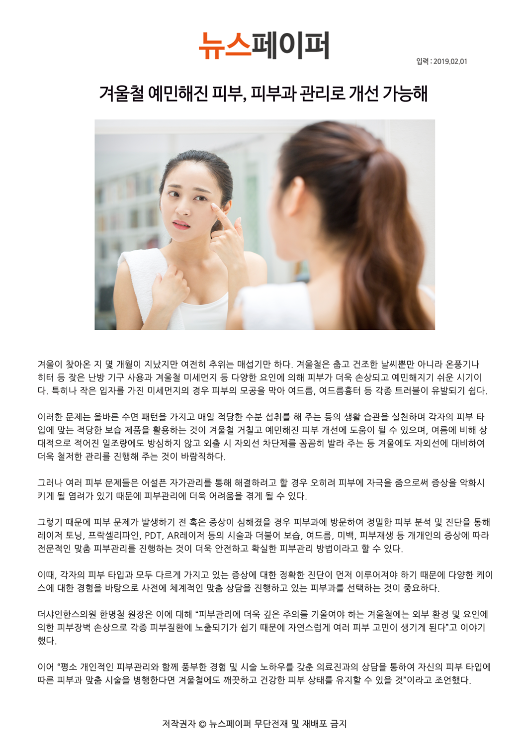 2019년 2월 1일, 더샤인한스의원 한명철 원장님의 겨울철 피부관리 관련 뉴스 기사가 올라왔습니다.